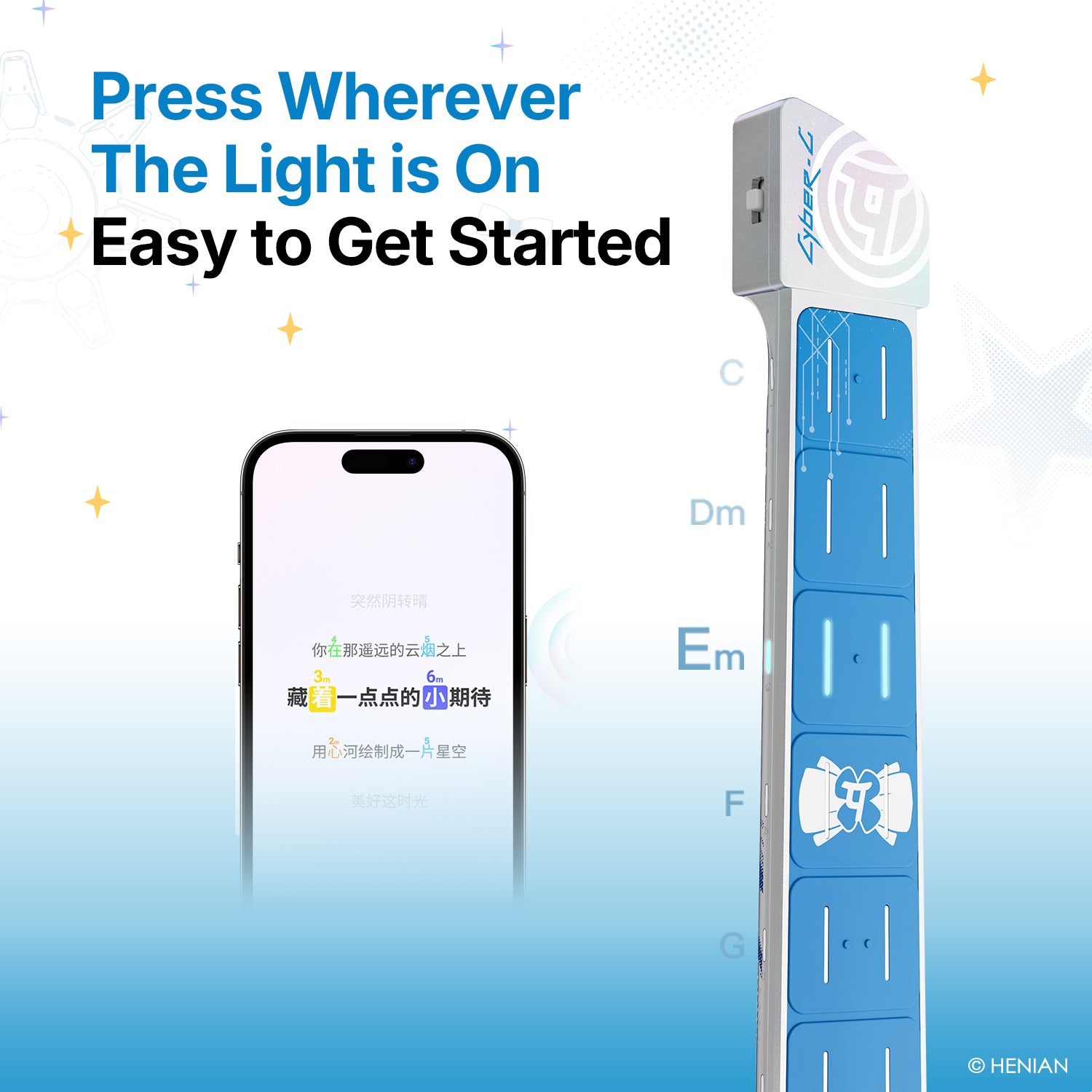 We’ve introduced the Smart Tab feature to enhance your singing and playing experience with Cyber-G. Just follow the numbered chord instructions in the Smart Tab, and effortlessly press the corresponding chord pad with your left hand. Playing chords has never been this simple. With simplified chord playing, you can focus more on your singing performances. And we'll always keep expanding the song library for Smart Tab.