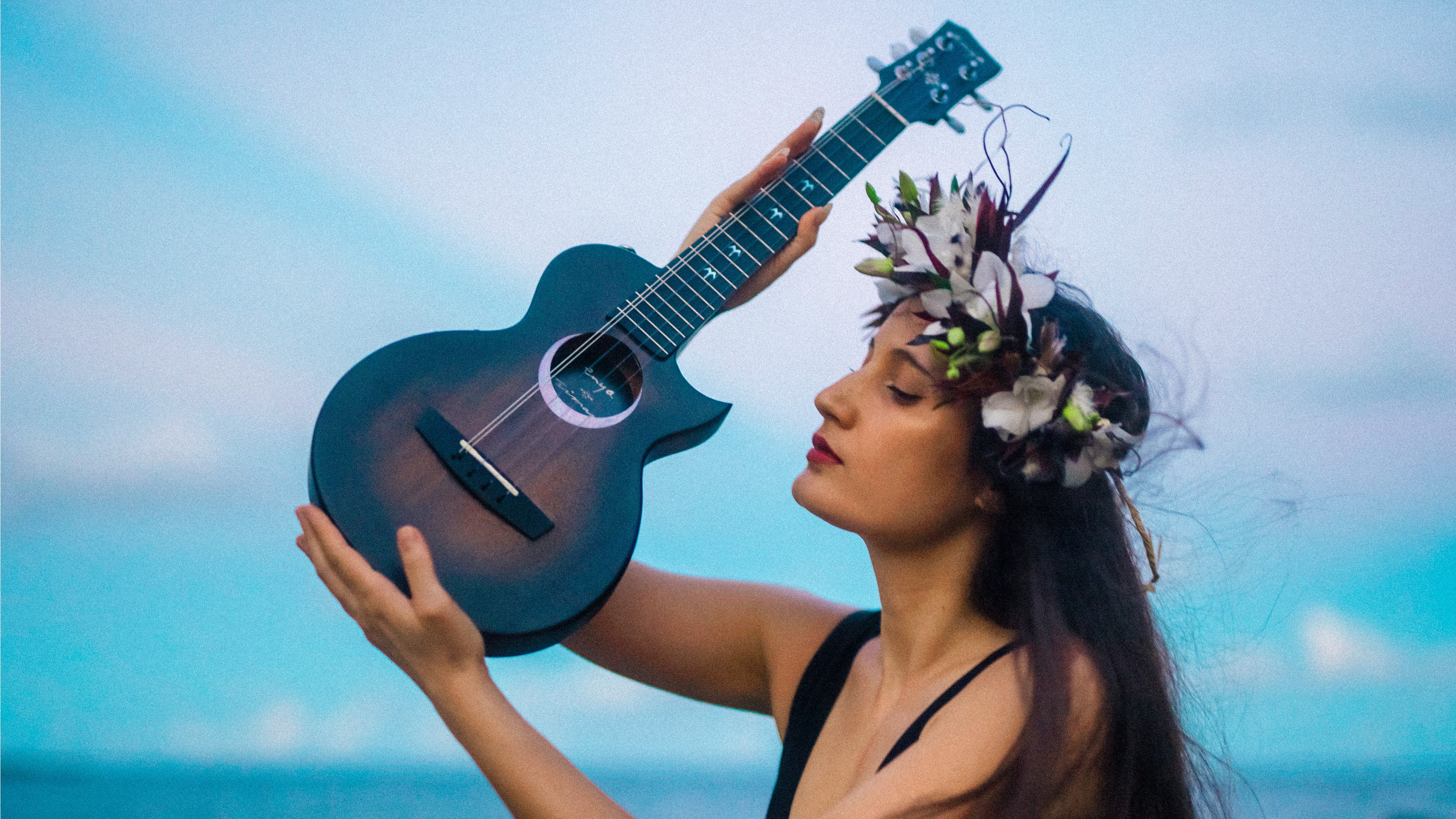 ' This ukulele represents the night sky. An abalone crescent moon cradles the sound hole. Iwa Birds on the fretboard will guide your fingers, and the night star on the crown of your ukulele will light the path to your musical soul. This signature ukulele represents who I am as an artist. Thank you for believing in me. ' —Taimane